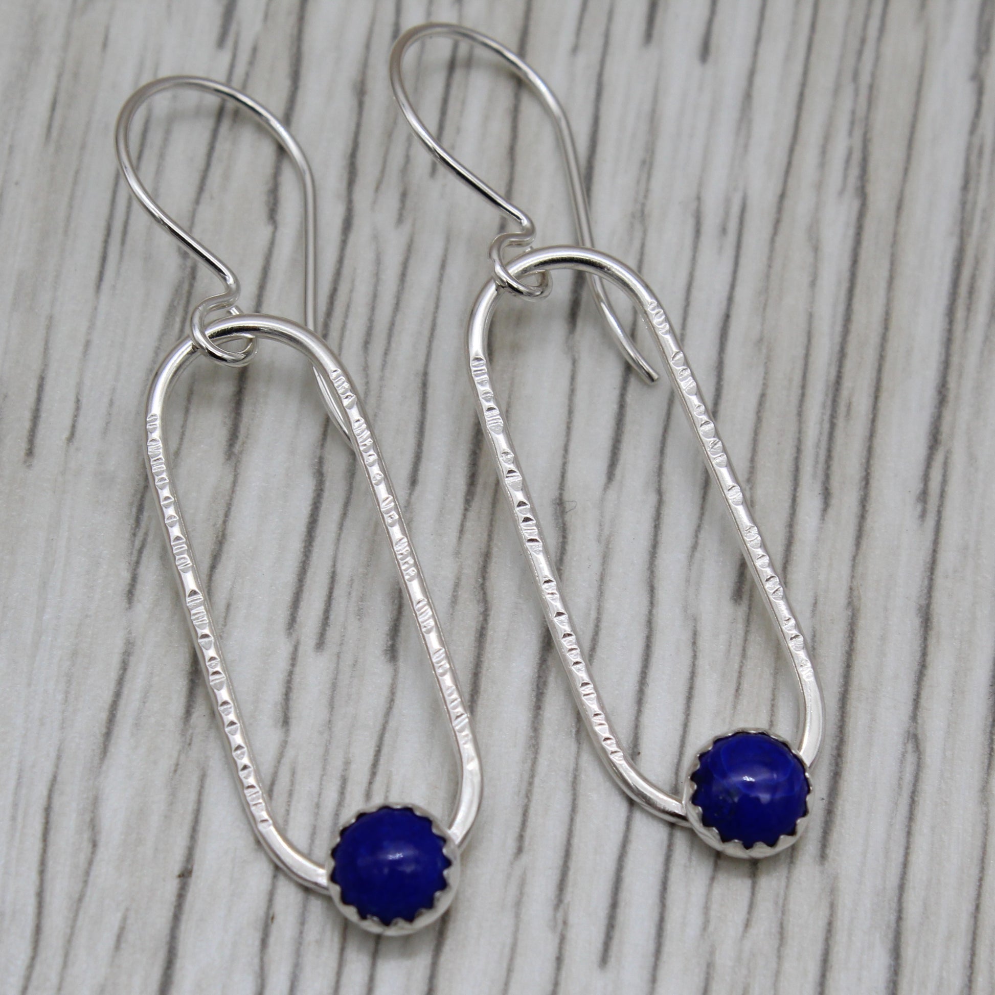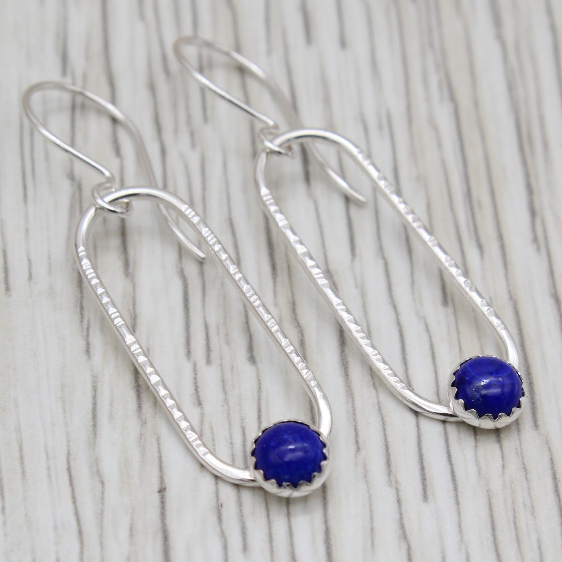 Let your style reach for the stars with these handmade lapis lazuli earrings. A stunning 6mm lapis lazuli stone—rich with celestial blues and golden flecks—rests in a fine silver bezel, soldered onto textured sterling silver ovals that shimmer with every movement. The hand-hammered details give these beauties genuine character and soul. Effortlessly chic and endlessly fun, they're made to be loved and worn.