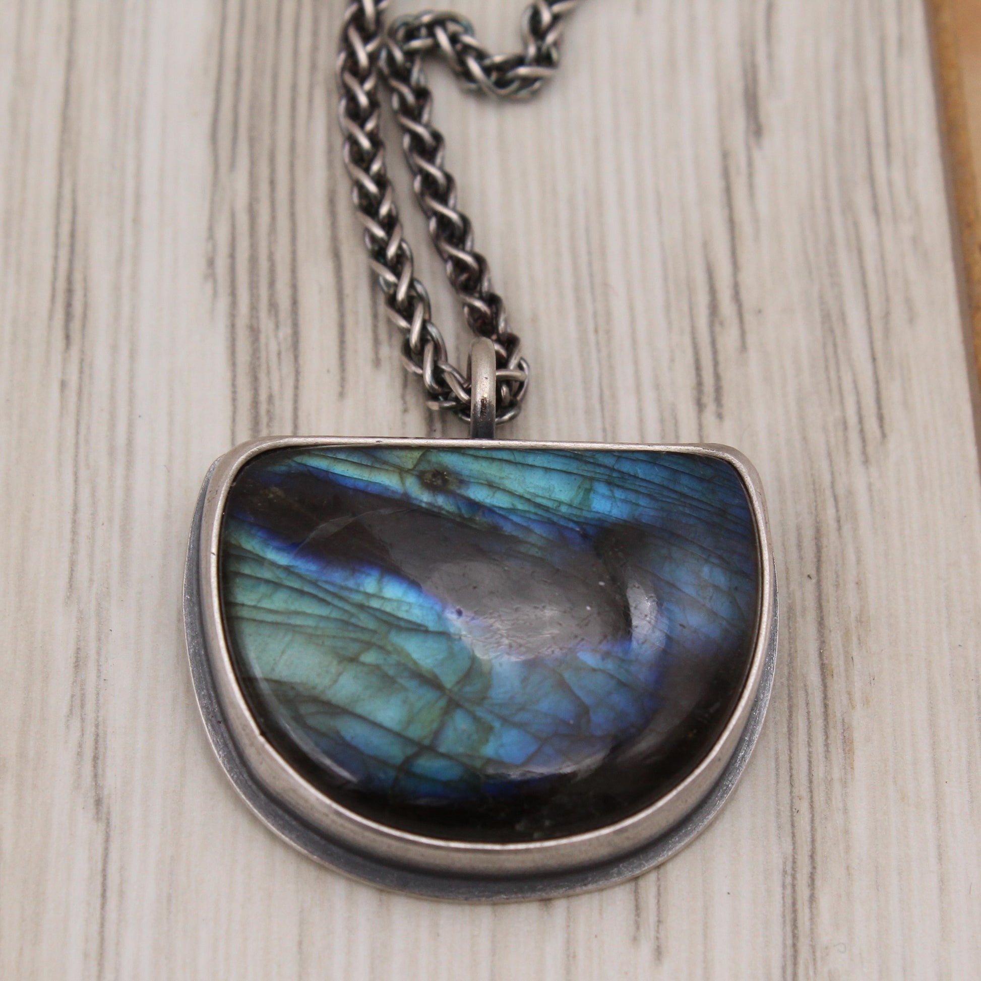 This handmade sterling silver necklace features a hand-cut lotus design on the backplate, beautifully showcased behind a flashy labradorite cabochon. The combination highlights the stone’s natural sparkle while symbolizing purity and growth, making it a graceful accessory for any occasion.