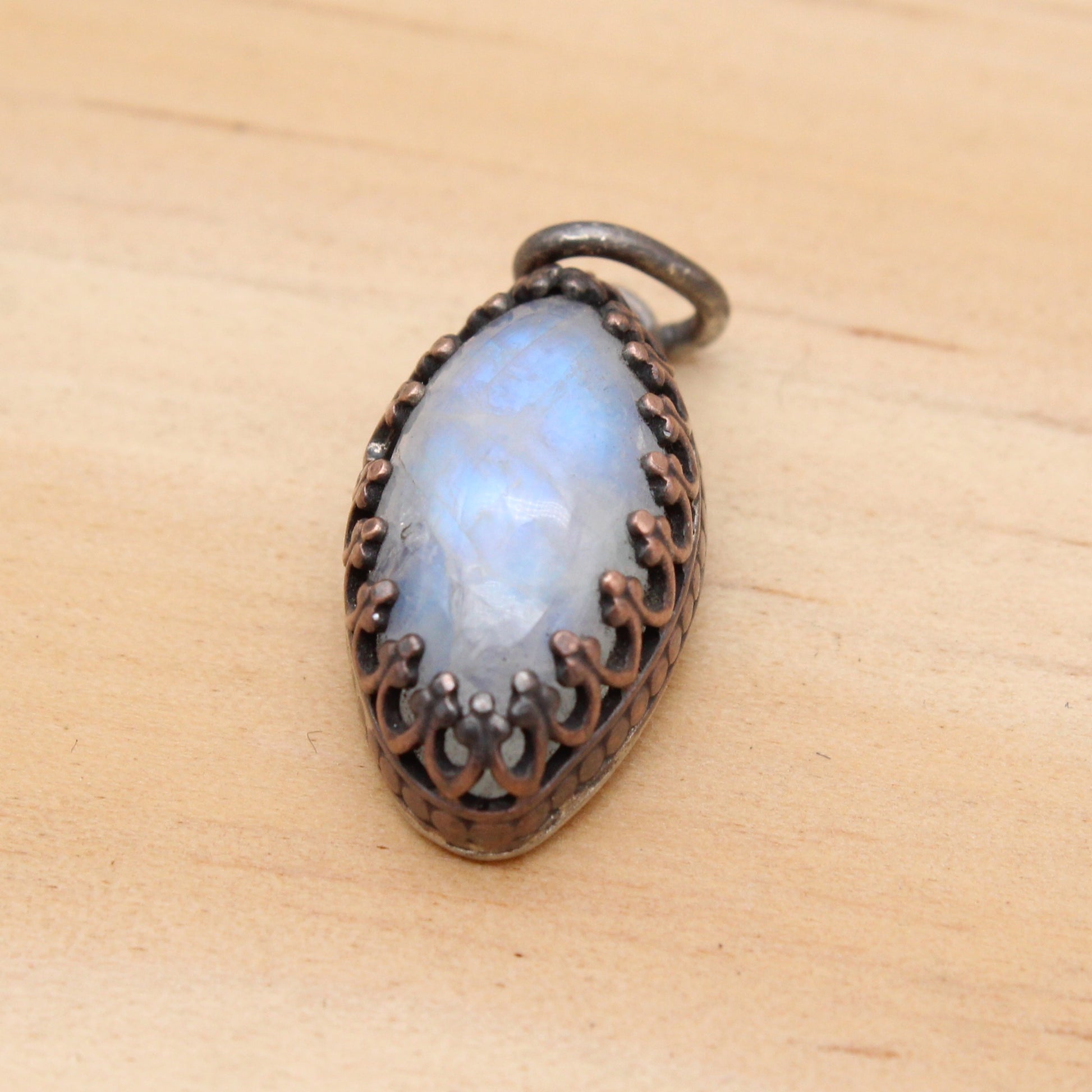 Swoon over this elongated marquise moonstone pendant with its mesmerizing rainbow shimmer. The stone is cradled in an ornate oxidized copper gallery setting that gives it old-world charm and textural interest. A sterling silver backplate keeps everything secure, choose the pendant only or on an 18-inch sterling silver chain. A whimsical piece that captures moonlight and turns it into wearable art.