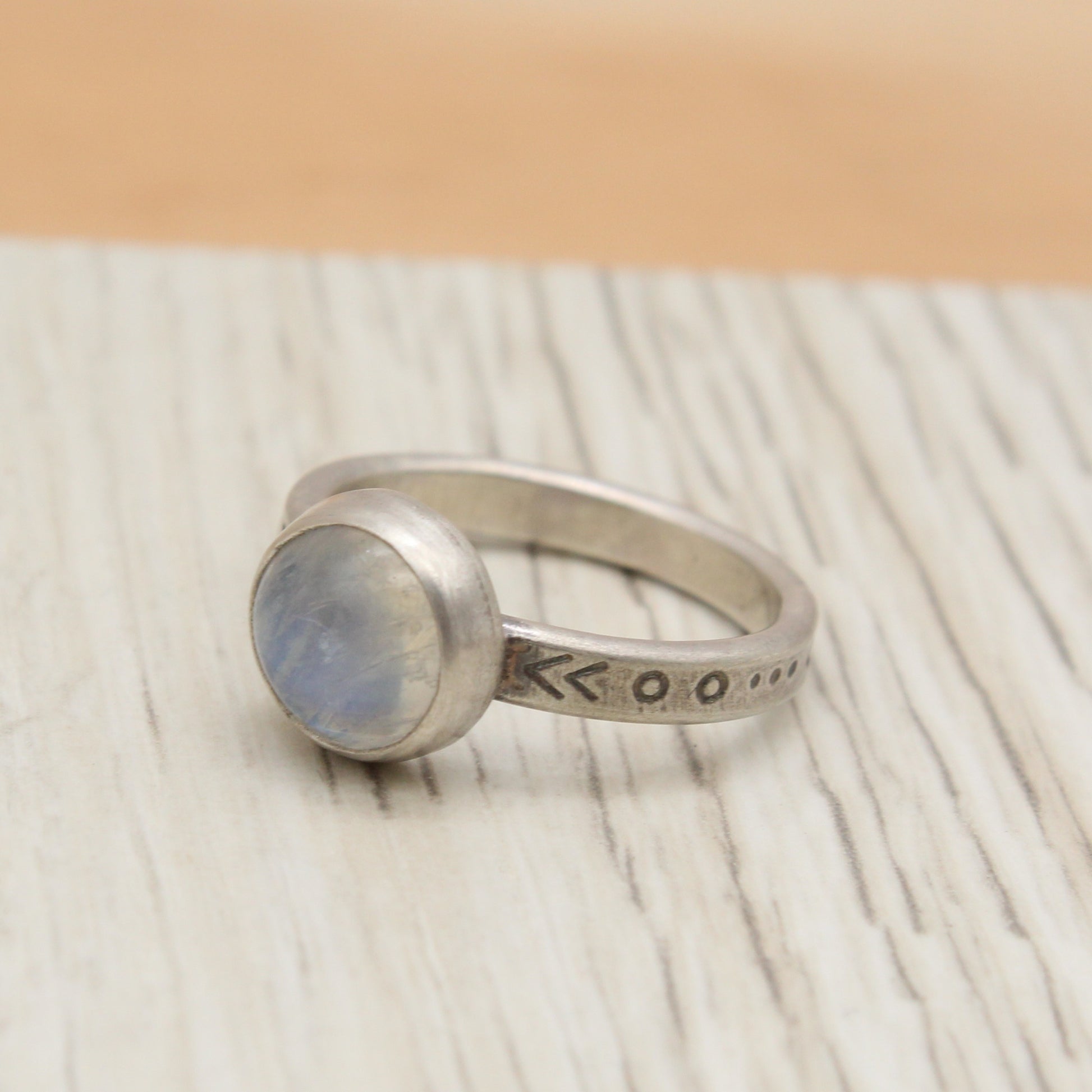 Catch the light and turn heads with this handcrafted sterling silver ring featuring a rustic stamped band and a stunning rainbow moonstone that dances with iridescent flashes. Uniquely stamped by hand, giving it character and charm that mass-produced jewelry just can't match. The moonstone's dreamy play-of-color shifts as you move, making it the perfect conversation starter. Sized at 7 and ready to wear, this ring brings a touch of bohemian magic to any outfit.