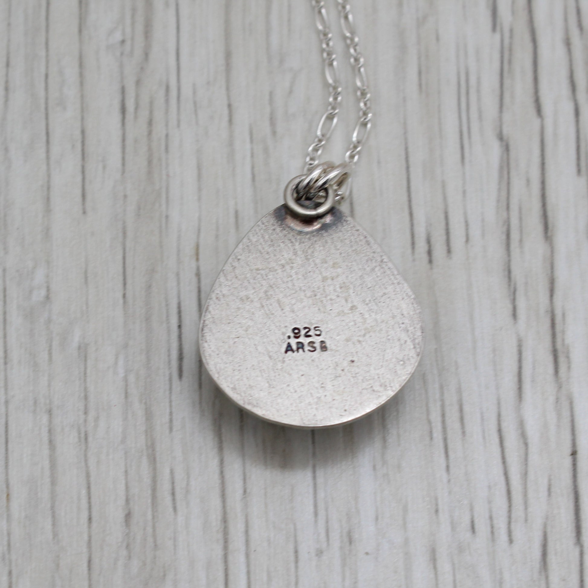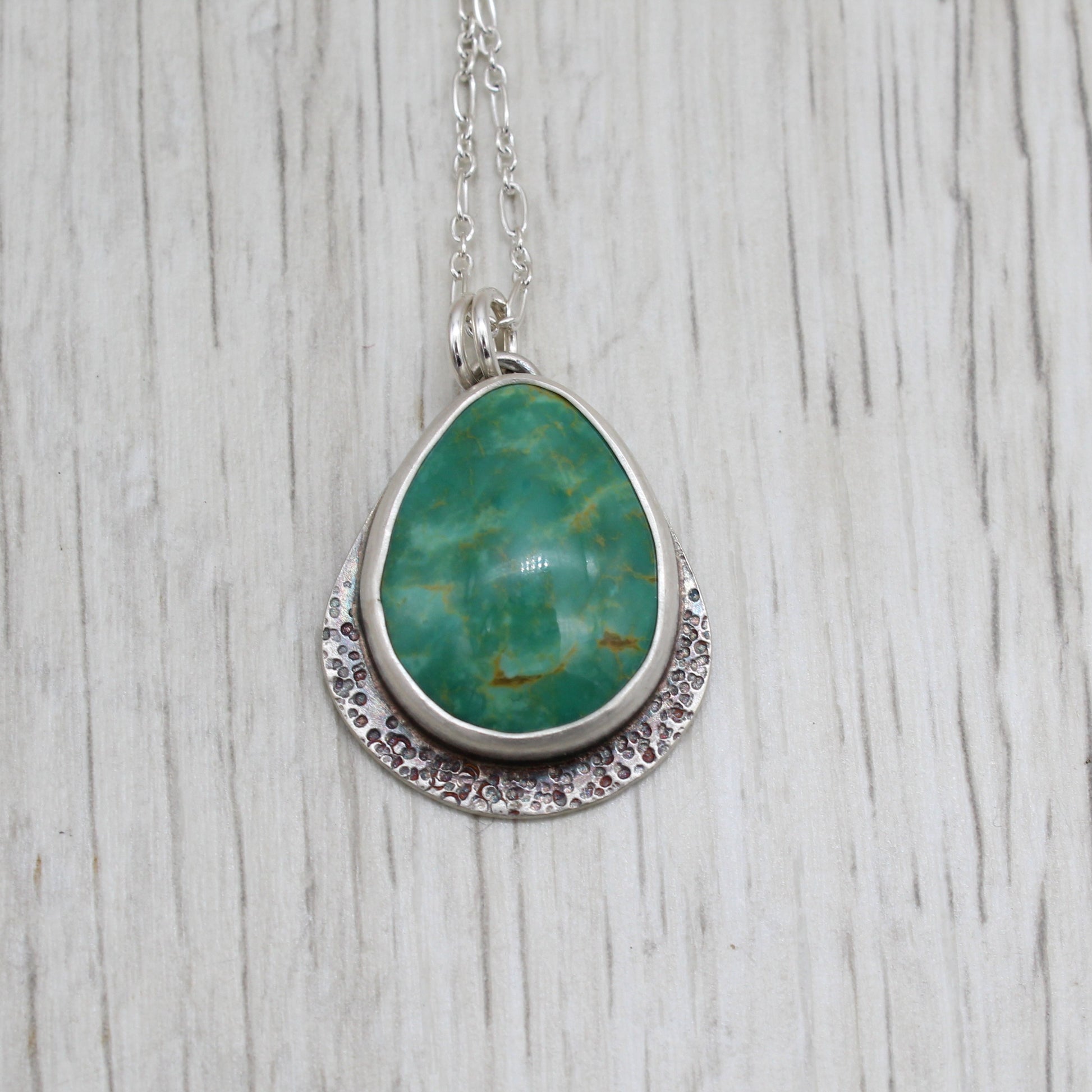 Handcrafted beauty in this one-of-a-kind necklace. Genuine Tyrone turquoise—prized for its rich, vibrant hue—sits nestled in a fine silver bezel, anchored to a reclaimed sterling silver backplate adorned with hand-hammered divots. The oxidized finish adds moody depth and vintage charm, making each piece a wearable work of art. Perfect for turquoise lovers who appreciate authentic craftsmanship and sustainable materials.